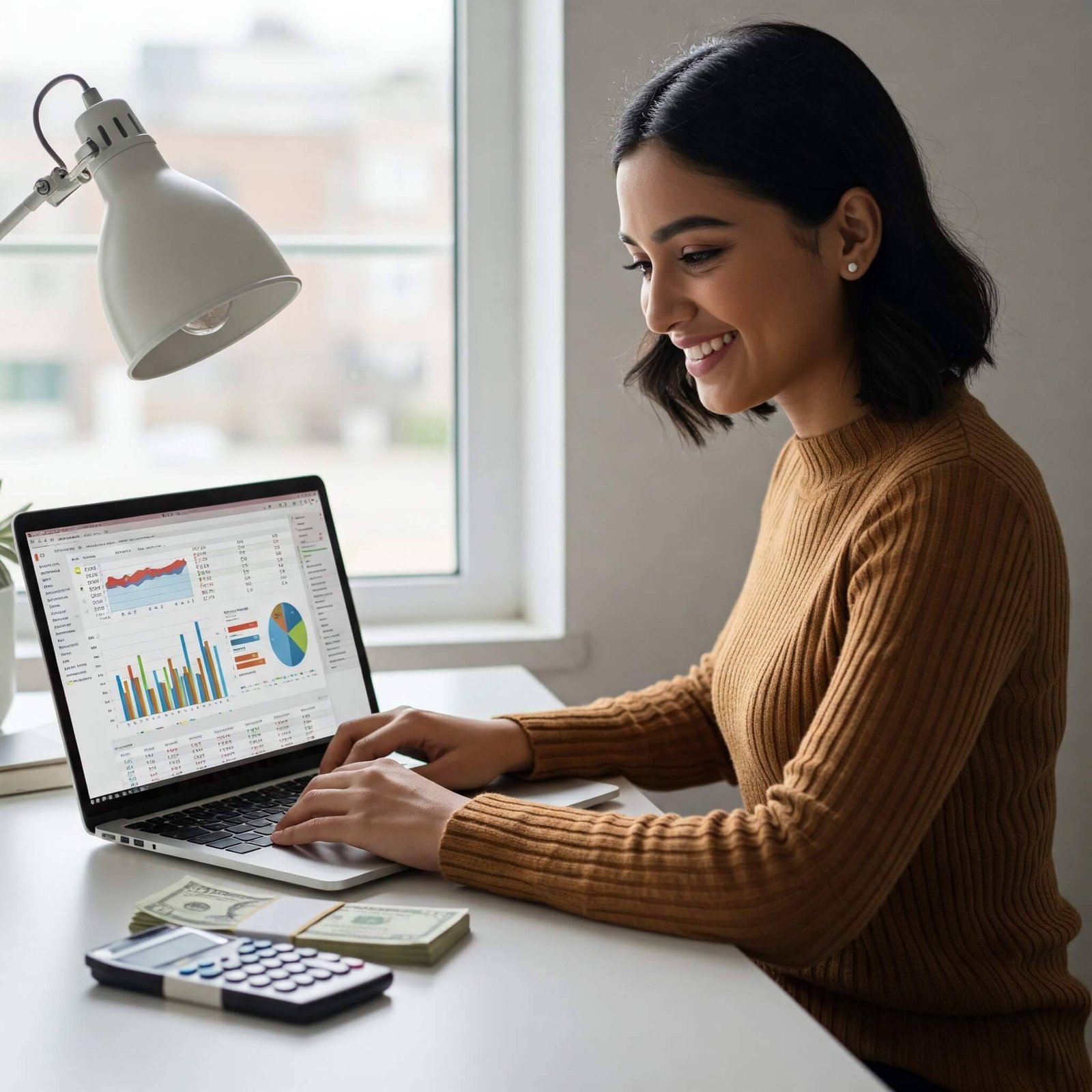 Smiling woman budgeting on laptop